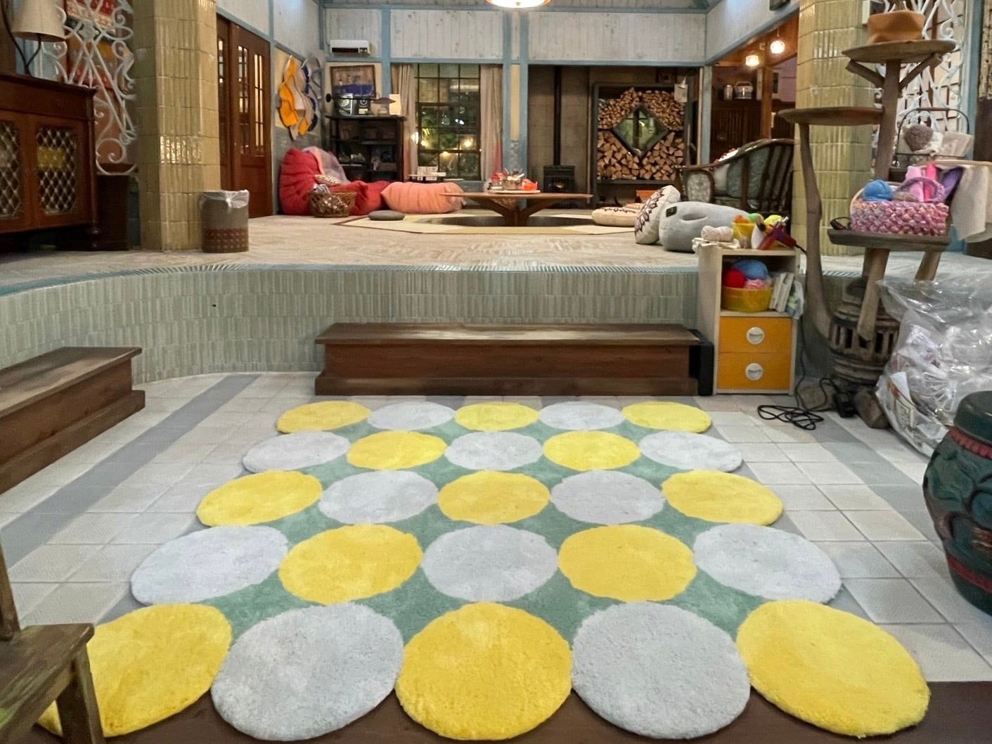 ドラマの中心であるお部屋のど真ん中で使用され、多くの俳優さんたちが実際に触れたラグになります。